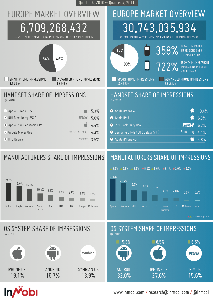 Naturalmente anche sull’advertising non può mancare il confronto tra sistemi operativi, per capire chi attrae più investimenti e magari su chi puntare nel 2012: Android si piazza al primo posto con il 21,2% delle impression a livello globale e il 32% a livello europeo. A sorpresa segue Nokia OS (18,8%), poi iPhone (16,7%).