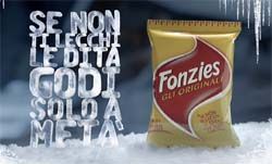 Fonzies è il nome di uno snack a base di mais e formaggio conosciuto e distribuito in tutto il mondo. Il marchio, rilevato nel 2001 dalla Saiwa, nasce in Italia nella prima metà degli anni ottanta, ereditando il nome dal personaggio di Happy Days Arthur Fonzarelli. Il prodotto ha mantenuto invariati nel corso degli anni alcuni elementi: il food design, il packaging, la composizione che gli conferisce il caratteristico gusto al formaggio; mentre la pubblicità si è evoluta, giungendo al famoso pay-off “Se non ti lecchi le dita godi solo a metà”. A nessun consumatore, infatti, sarà sfuggito che il gustoso snack lascia le dita unte e salate, e in qualche modo ci si deve pur liberare da quel fastidioso “polline di formaggio”, prima di passare ad acqua e sapone.