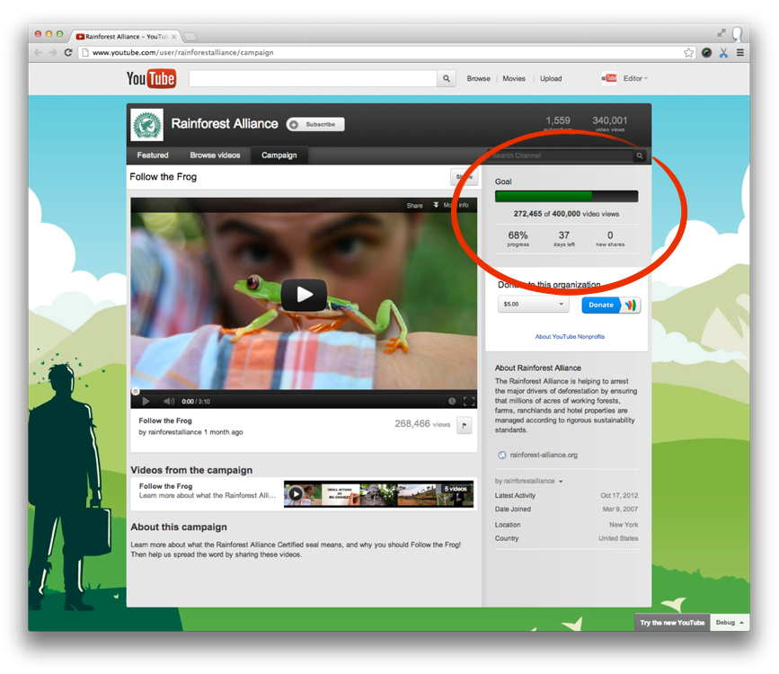Di recente da Mountain View hanno diffuso alcuni strumenti utili e mirati ai gestori di campagne non-profit su YouTube. Se ne parla sul blog ufficiale. Si traduce con un nome: “Campaigns“, appunto. Attraverso il quale fissare obiettivi specifici all’interno di un canale e monitorare l’evoluzione degli stessi, una volta diffusi i video sul web. Ma non solo: gli utenti stessi possono essere messi al corrente dell’obiettivo da raggiungere e posso dunque aiutarvi, facendo circolare il video e condividendolo in rete.